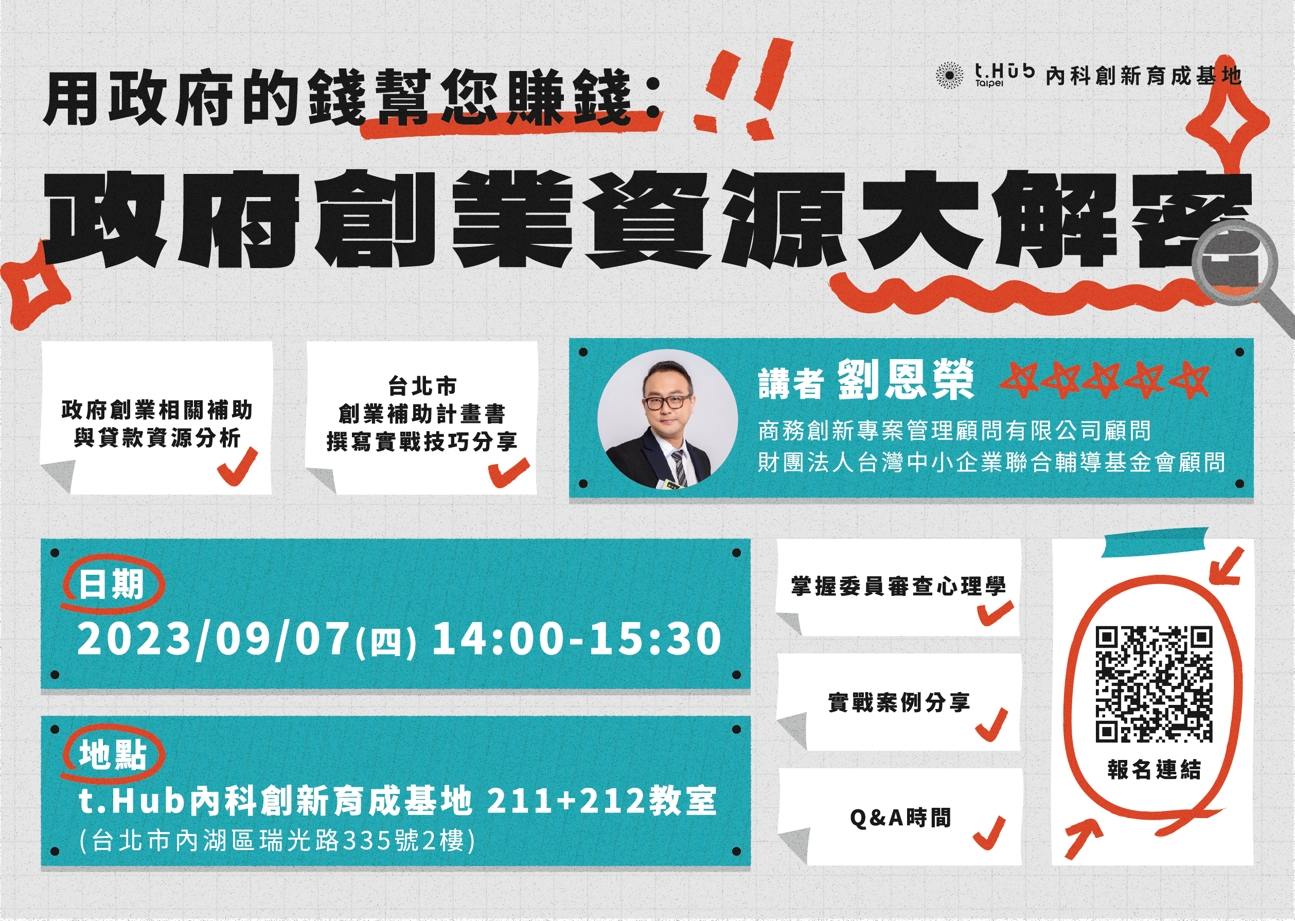 【2023.9.7(四)用政府的錢幫您賺錢:政府創業資源大解密】
