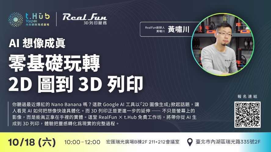 這堂由 RealFun × t.Hub 聯合舉辦的 AI 智能 2D → 3D 免費工作坊,就是要帶你親自體驗這個過程:從 AI 生成圖像、到 Blender 修模,再到立體列印,讓你的腦洞創意不只停留在螢幕,而是「變成實體」!