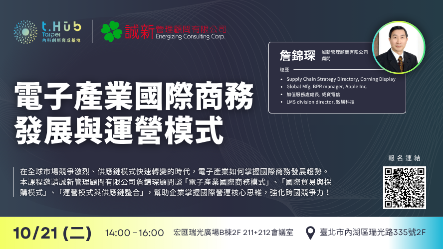 本課程邀請 誠新管理顧問有限公司顧問 詹錦琛 主講,曾任 Corning Display 供應鏈策略總監、Apple 全球製造流程改善經理、威寶電信加值服務處處長 等職,具備深厚的國際商務與產業經驗。