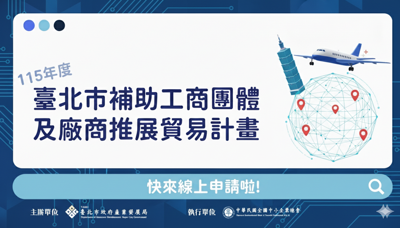 115年度「臺北市補助工商團體及廠商推展貿易計畫」自115年3月2日至4月7日開放線上申請。凡於北市登記之工商團體或廠商,參加115年度國內外展覽,均可申請場地租金及佈置費補助。國外展覽每案最高補助8萬元,國內4萬元;若能提出受美國關稅影響證明者,國外案補助最高可加碼至10萬元。每單位限申請2案,總經費3,000萬元,採擇優補助至用罄為止。